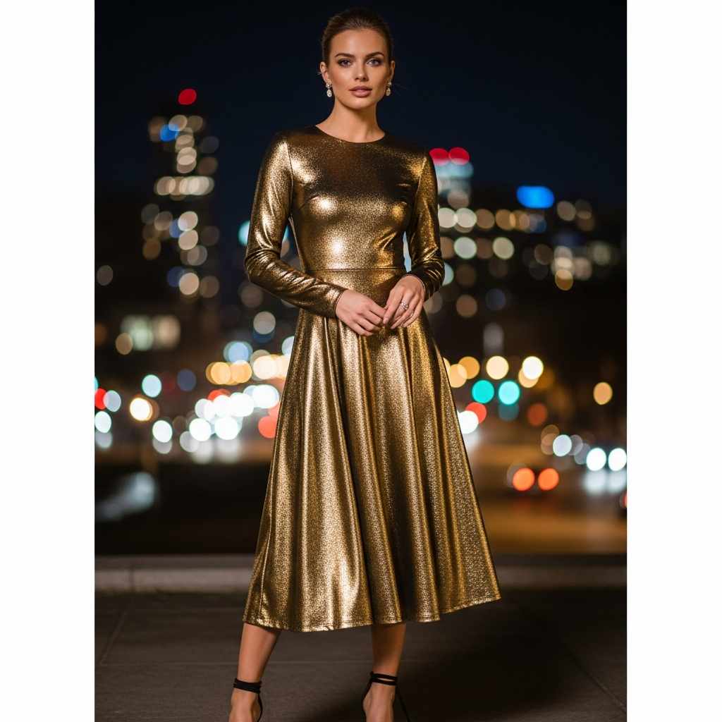 Metallic fabrics in silver, gold, and bronze move into cold weather with long-sleeved dresses, metallic knits, and shimmering accessories. The shine brings light to dark winter months while feeling festive for holiday season.