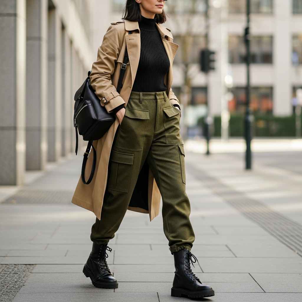 Cargo pockets, drawstrings, and military-inspired details appear on elevated pieces like wool trousers, cashmere sweaters, and even evening wear. The functional details add visual interest and practical storage.