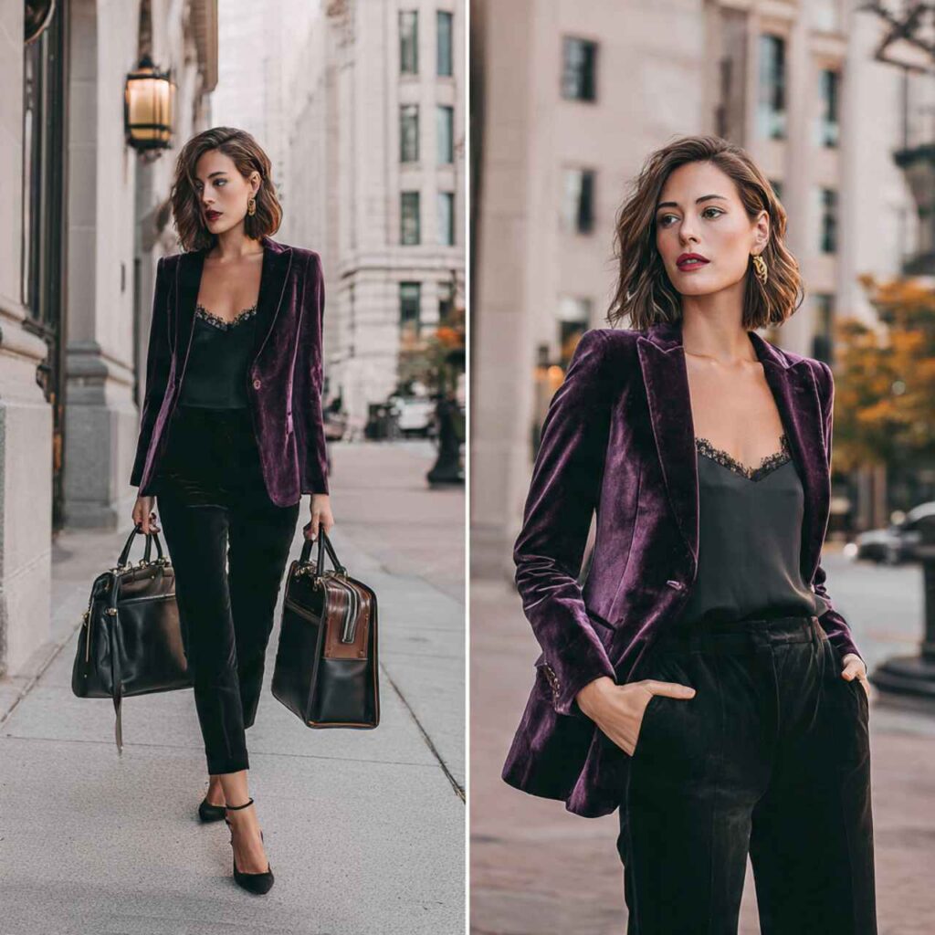 Velvet moves firmly into daywear with velvet blazers, pants, and even shirts in deep jewel tones. The luxurious texture adds richness to casual outfits and brings tactile interest to solid colors.