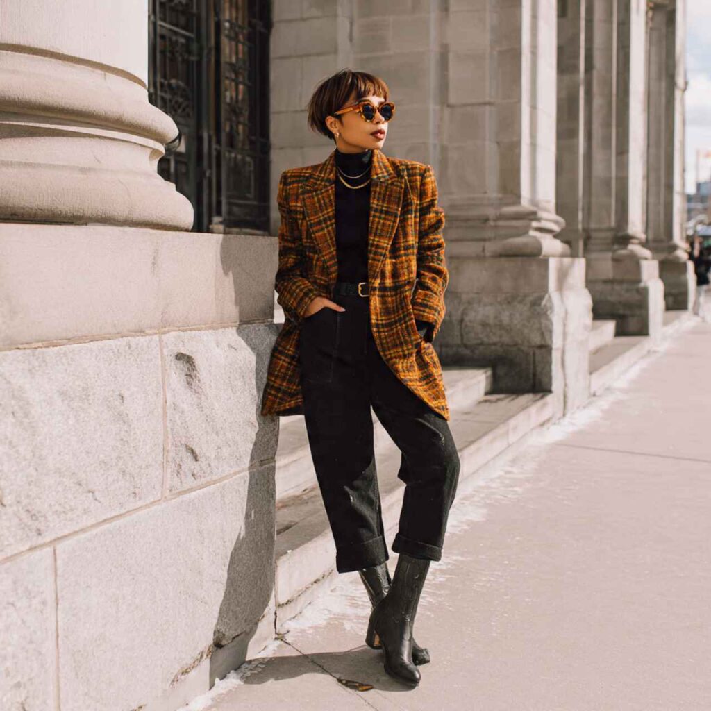 A bold plaid blazerโ€”oversized, in fall colorsโ€”worn with simple black pants and a black tee lets the blazer shine. Add black boots.