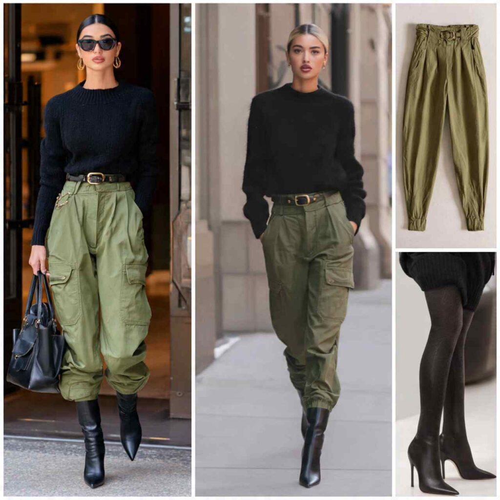 Olive or beige cargo pants with a fitted black sweater and pointed-toe heels or boots creates utility-meets-chic.