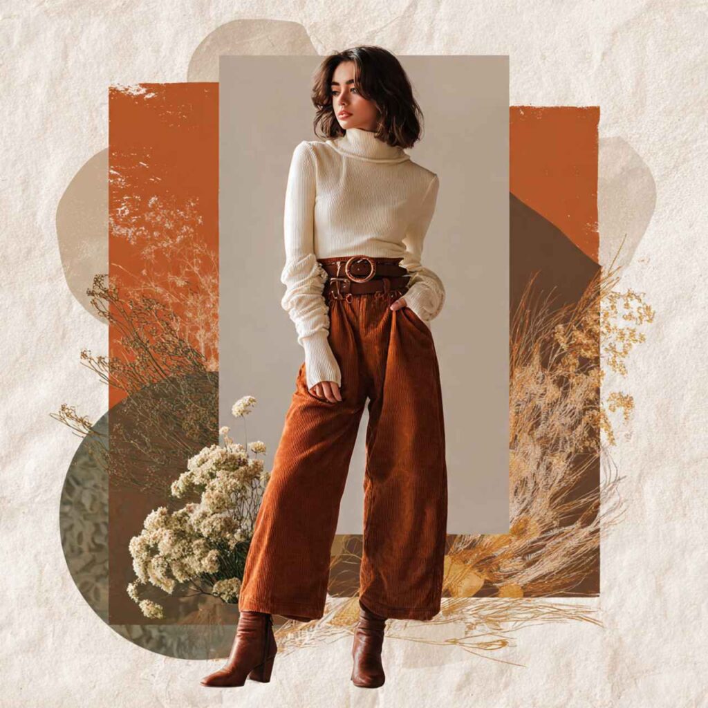 Corduroy pants in a fall colorโ€”rust, brown, or forest greenโ€”with a complementary sweater creates textured vintage charm.