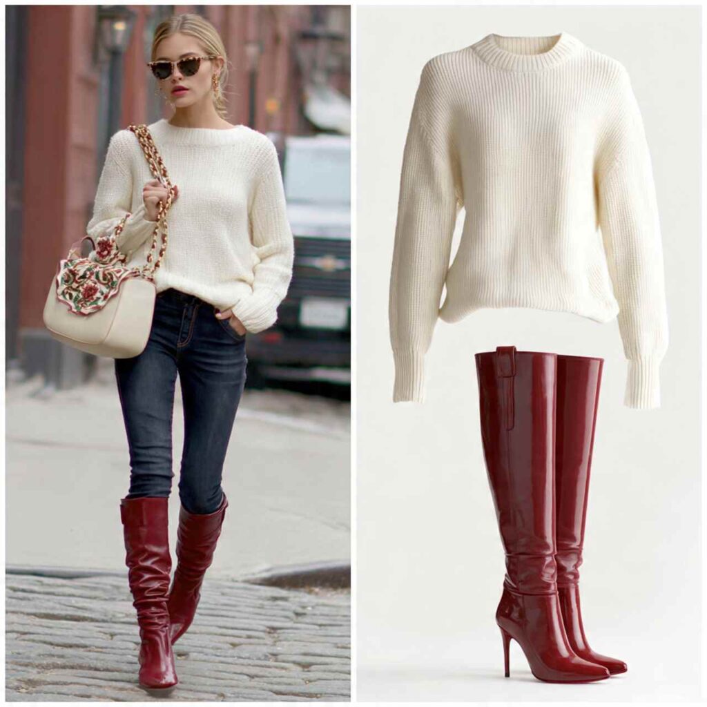 White or cream jeans styled with fall colorsโ€”rust sweater, brown jacketโ€”defies seasonal “rules” while looking fresh.