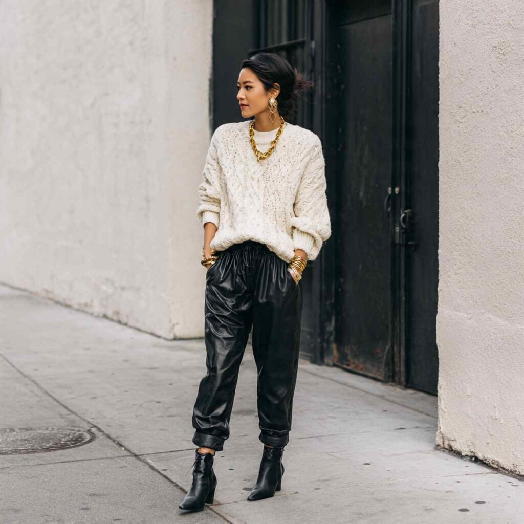 An oversized chunky cable knit sweater in cream or oatmeal tucked into high-waisted leather pants creates texture contrast. Add ankle boots and minimal gold jewelry.