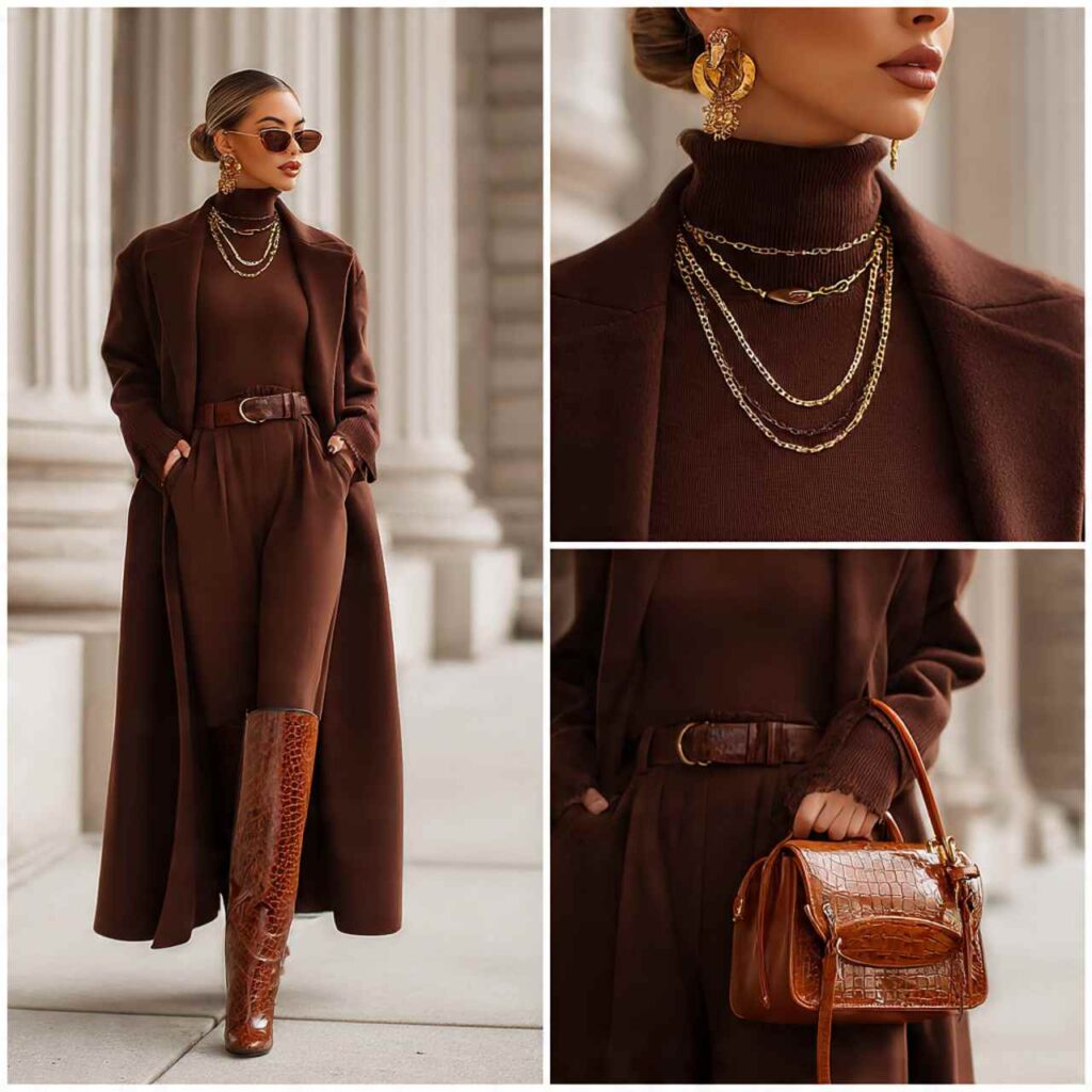 Head-to-toe chocolate brownโ€”brown trousers, brown sweater, brown coatโ€”creates rich monochrome sophistication. Add cognac accessories and gold jewelry.