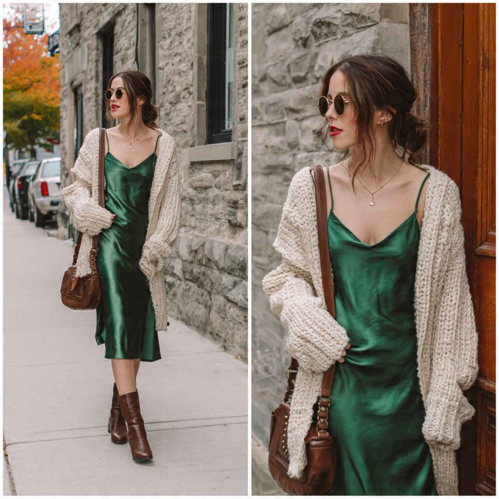A satin slip dress in a jewel tone layered under a chunky oversized cardigan creates high-low mixing. Add ankle boots and a shoulder bag.