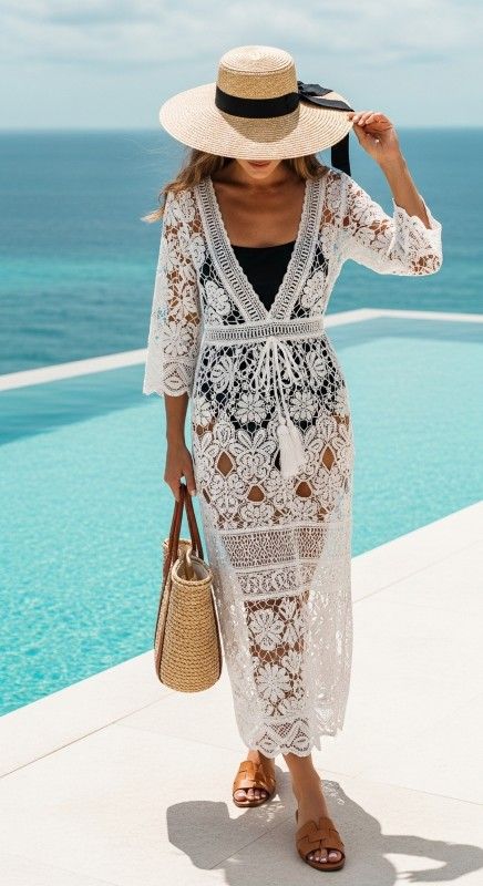 Why It Works: A white crochet maxi cover-up is the ultimate poolside essential. The intricate openwork pattern creates beautiful texture while providing just enough coverage. Over a sleek black one-piece, the contrast is striking and sophisticated. The maxi length flows beautifully and transitions seamlessly from pool to lunch.