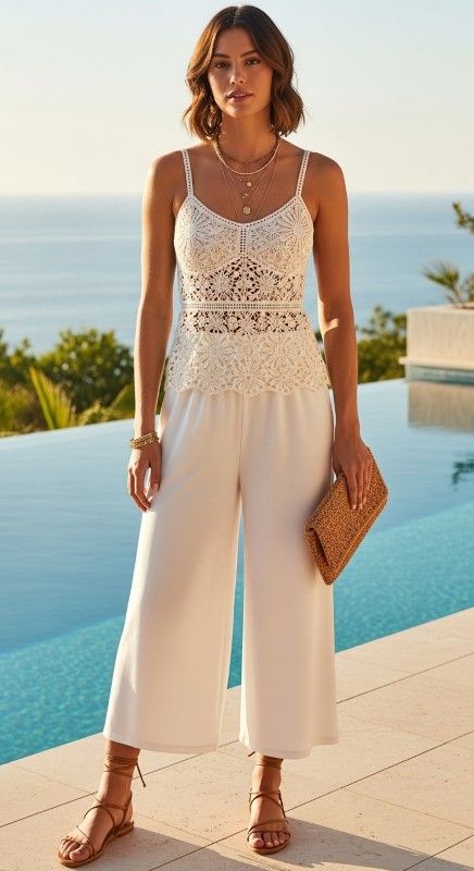 Why It Works: This sophisticated combination pairs a delicate crochet camisole with flowing swim culottes. The crochet adds texture and femininity while the culottes provide elegant coverage and movement.
