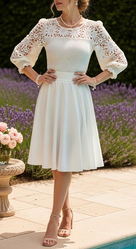 Why It Works: This feminine combination features a crochet peplum top that flares at the waist, creating a flattering silhouette. The peplum adds movement and romance while the crochet adds handmade beauty.