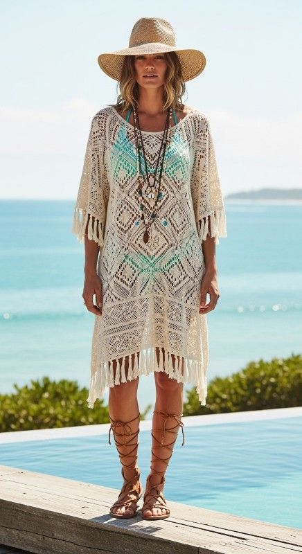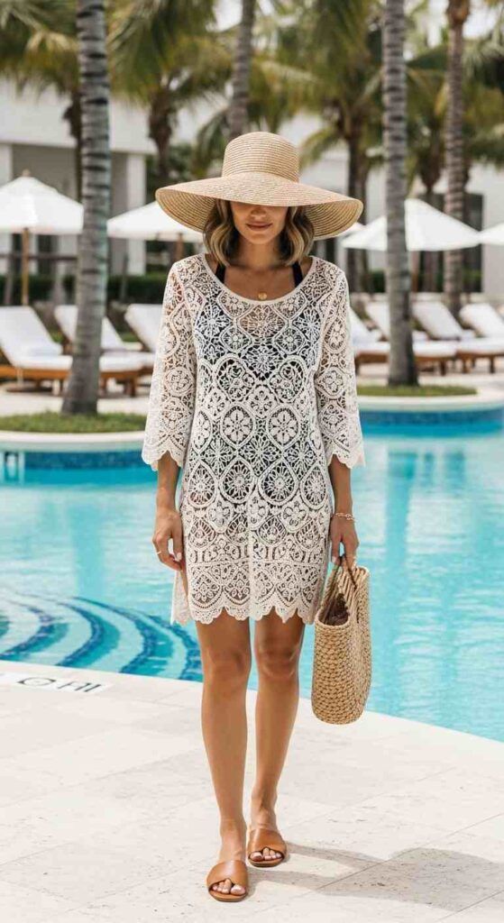 Why It Works: A crochet tunic provides comfortable coverage while showcasing beautiful handcrafted details. The longer length is flattering and practical, while the openwork crochet keeps you cool. Perfect for modest poolside style.