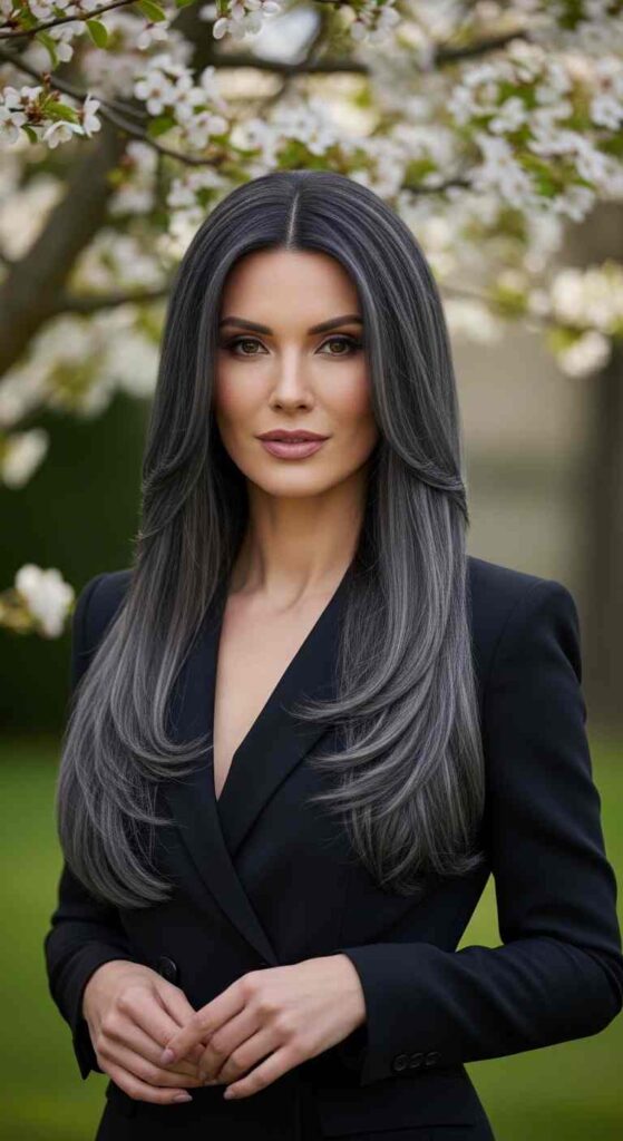 Dark shadow root with ash lengths creates spring dimensional contrast.