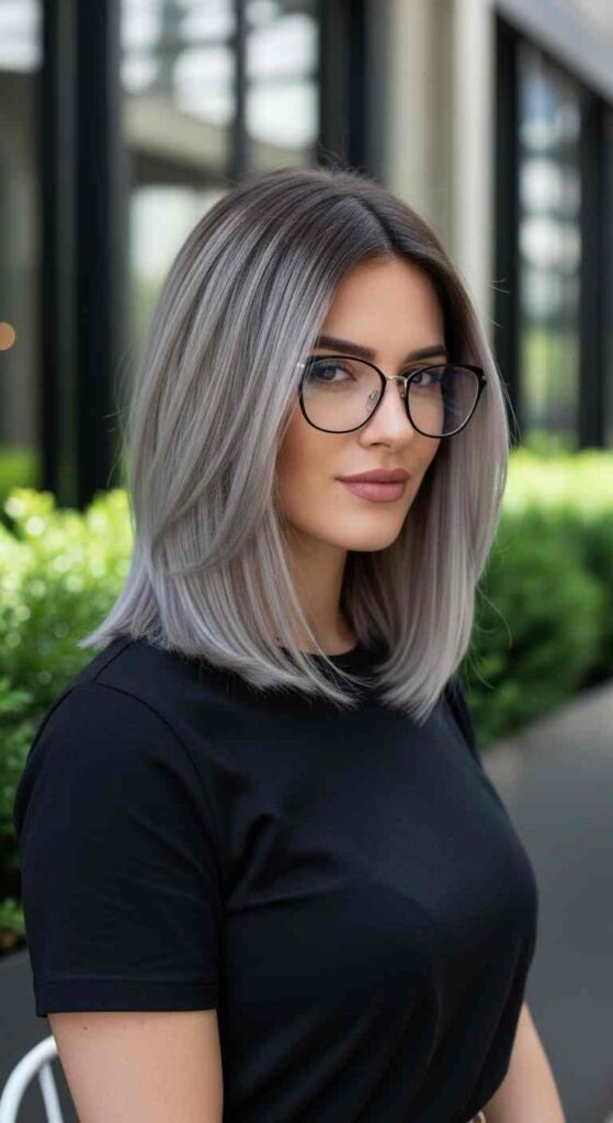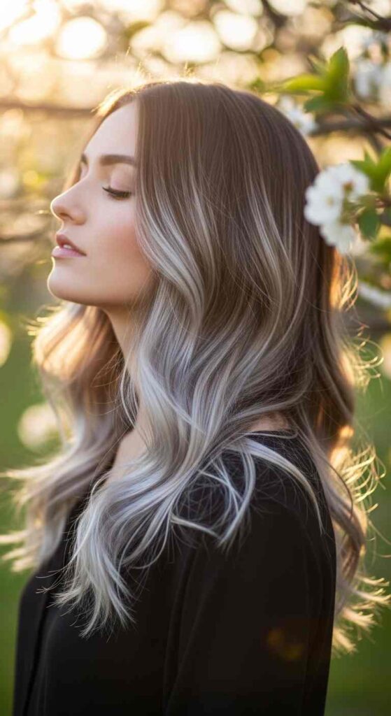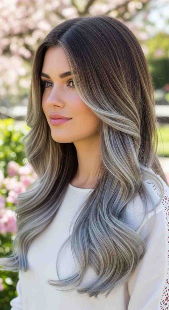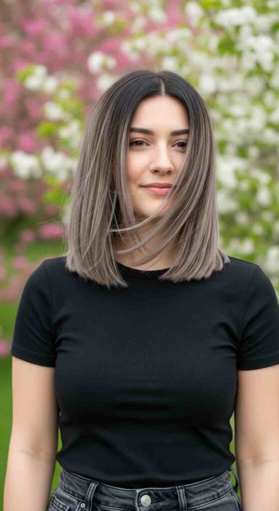 Dark roots with lighter ash lengths creates low-maintenance spring dimension.