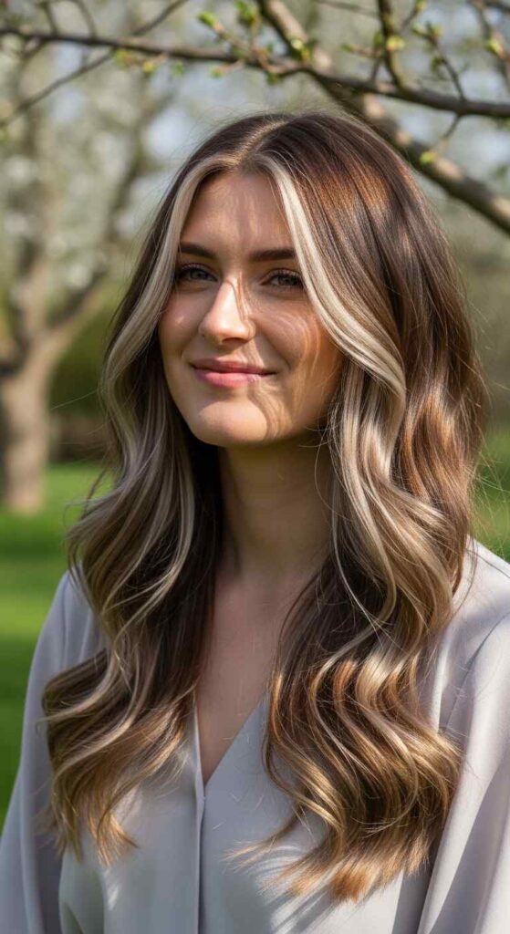 Ash blonde pieces blending into brown creates spring high-contrast dimension.