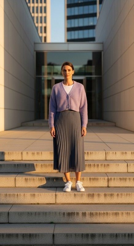 Why It Works: Pleats create elegant movement, while a lightweight cropped knit adds cozy contrast without trapping heat. This look bridges casual and polished effortlessly, especially in muted tones like slate, sand, or lavender.