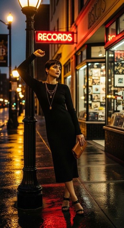 Why It Works: Ribbed fabric hugs without clinging, making it surprisingly comfortable in warm weather. The vertical texture elongates the frame, while layered chains add visual interest to a simple silhouette. Slip it on and go.