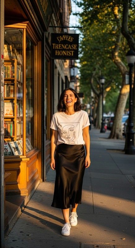Why It Works: Don’t underestimate the power of contrast. A casual graphic tee tucked into a high-waisted satin skirt feels effortlessly cool and date-ready. It’s relaxed but intentional, perfect for low-key summer evenings.