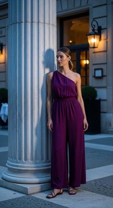 Why It Works: One-shoulder cuts feel architectural and modern, while a full-length jumpsuit keeps you covered without feeling heavy. Flat sandals keep the look grounded and comfortable for long summer nights.