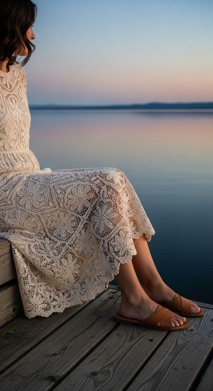 Why It Works: Crochet is inherently summery, but a midi length with a lined underlayer keeps it elegant and date-appropriate. Slides add ease, making this ideal for warm, casual evenings where comfort matters most.