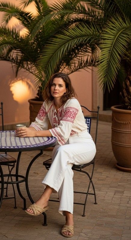 Why It Works: Embroidered tops bring artisanal charm, while crisp white wide-leg pants keep the look airy and modern. Together, they create a boho-elegant vibe that’s comfortable enough for long summer conversations.