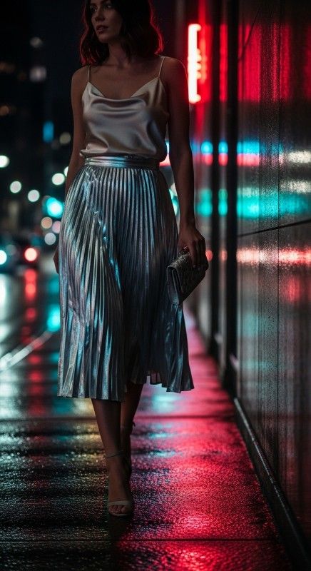 Why It Works: A metallic pleated skirt catches every light source, making it ideal for evening outings. Paired with a soft silk camisole, the look balances shine and subtlety while staying cool and breathable.