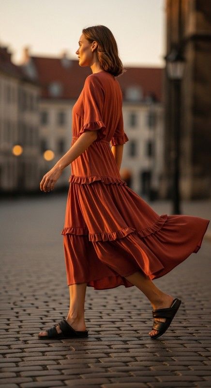 Why It Works: Ruffles add playful movement, especially when you’re walking to dinner or dancing under fairy lights. The midi length keeps it date-appropriate, while the structured sandals ground the outfit so it doesn’t feel too frilly.