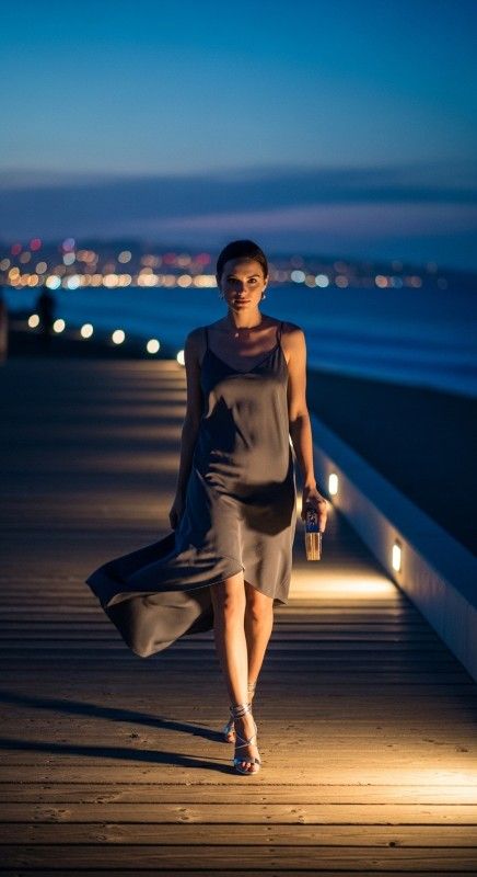 Why It Works: An uneven hemline adds modern intrigue to a classic slip dress. The diagonal cut creates visual interest while keeping the outfit lightweight. Metallic heels catch ambient light, making every step feel intentional.