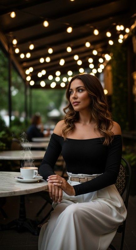 Why It Works: Off-shoulder styles highlight collarbones beautifully, while palazzo pants provide maximum comfort and drama. The combination feels elevated yet breezy, perfect for a long summer dinner. Add a thin belt if you want extra waist definition.