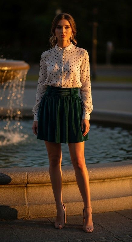Why It Works: Polka dots bring retro charm without feeling costumey, especially when paired with a sleek black bodysuit that keeps the top half streamlined. The look is timeless, playful, and incredibly flattering.