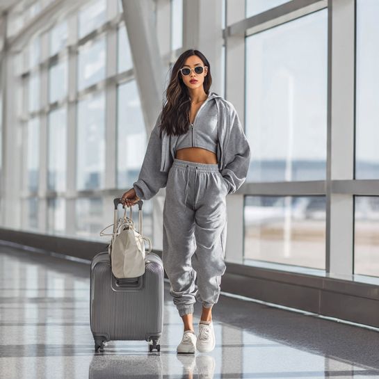 Coordinated comfortable casual. Matching cropped hoodie and high-waisted joggers in soft grey creates polished athleisure perfect for errands or travel.