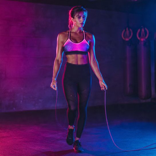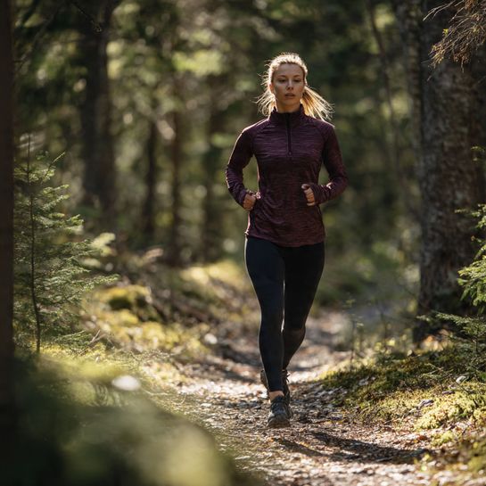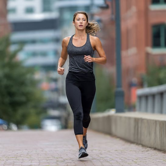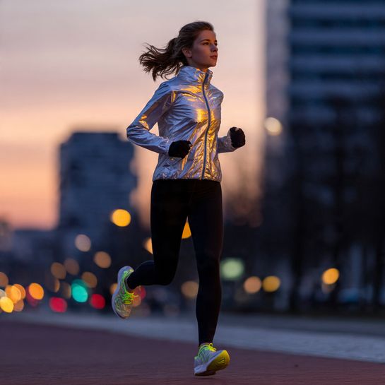 Safety meets style. Reflective windbreaker over running tights ensures visibility for early morning or evening runs while looking polished.