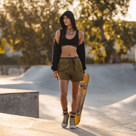 Minimalist athletic casual. High-waisted biker shorts with oversized graphic or plain tee creates comfortable look for low-key workouts or lounging.