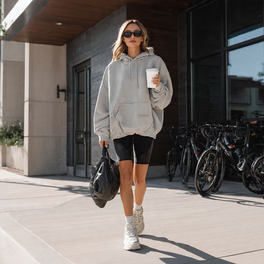 Relaxed top balances fitted bottom. Cozy oversized hoodie paired with black bike shorts creates comfortable casual look for post-workout errands.