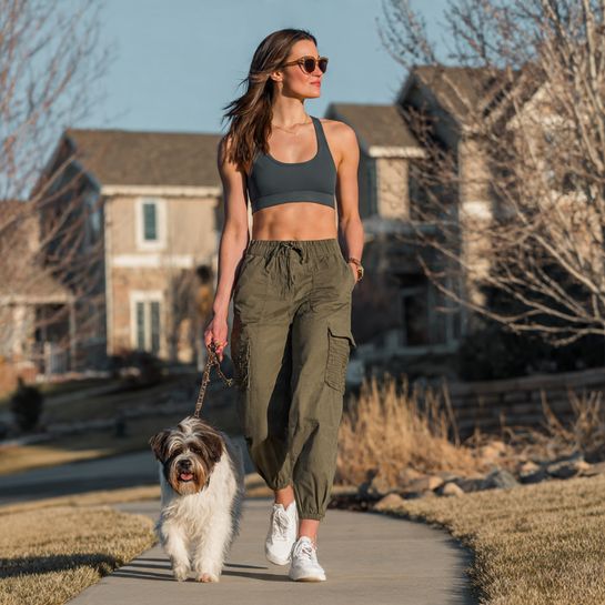 Athletic meets utilitarian. High-support sports bra worn with cargo-style joggers featuring pockets creates functional fashion-forward look.