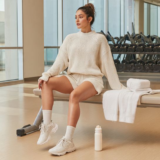 Cozy athletic hybrid. Coordinated knit sweater and matching athletic shorts creates comfortable transitional outfit for warming up or cooling down.