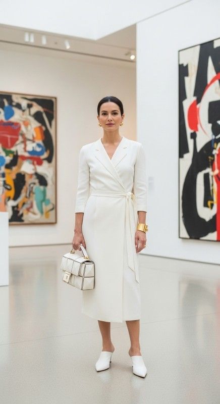 Embrace clean lines and understated elegance with an ivory white wrap dress that epitomizes minimalist summer style. The architectural cut and premium fabric quality speak volumes without needing embellishment or loud patterns. White leather mules and a structured geometric handbag maintain the monochromatic sophistication. A single delicate gold cuff bracelet provides the only jewelry, letting the dress design shine. This refined look is perfect for art gallery openings, architectural tours, or modern urban exploration. The crisp color reflects heat while projecting confidence and contemporary taste.
