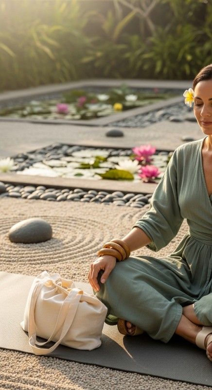 Find your center in a calming sage green wrap dress perfect for yoga retreats, spa days, or mindful outdoor gatherings. The soothing color promotes tranquility while the comfortable fabric allows for easy movement throughout your day. Natural cork wedge sandals and an organic cotton tote bag align with wellness-focused values. Simple wooden bangle bracelets and fresh flowers tucked behind your ear enhance the natural aesthetic. This outfit supports a lifestyle centered on balance, health, and environmental consciousness. The muted green tone complements natural surroundings beautifully.