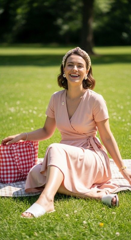 Enjoy summer’s simple pleasures in a soft peach wrap dress that’s as sweet as the season’s freshest fruit. This cheerful color creates an inviting, approachable vibe ideal for casual outdoor gatherings and family events. White flat sandals and a gingham picnic blanket tote enhance the nostalgic summer feel. Delicate daisy chain accessories or a floral headband add whimsical touches to the ensemble. This outfit is perfect for park picnics, outdoor concerts, or visiting pick-your-own fruit farms. The warm peach tone photographs beautifully in natural sunlight.