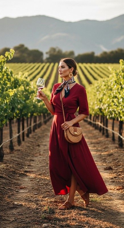 Sip and savor in a rich burgundy wrap dress that’s perfectly suited for wine country tours and vineyard tastings. The deep wine-red hue complements rolling vineyard landscapes and rustic tasting room aesthetics. Cognac leather sandals and a woven crossbody bag add earthy, sophisticated touches. Gold hoop earrings and a silk scarf tied at the neck enhance the refined country chic vibe. This outfit transitions beautifully from daytime tastings to elegant estate dinners. The luxurious color and flattering silhouette make you feel as exceptional as the wines you’re sampling.