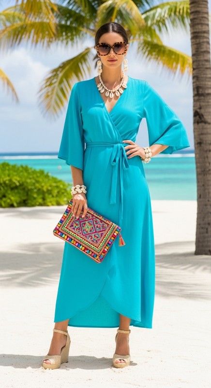 Escape to paradise in a vibrant turquoise wrap dress that captures the crystal-clear waters of tropical destinations. This vacation-ready piece is ideal for resort wear, beach club lunches, or island exploration. Natural raffia wedges and a colorful embroidered clutch celebrate artisan craftsmanship and vacation vibes. Shell jewelry and oversized tortoiseshell sunglasses complete the resort-ready ensemble. The bright blue-green color looks stunning against sun-kissed skin and tropical backdrops. This dress makes every photo look like a postcard from your dream vacation.