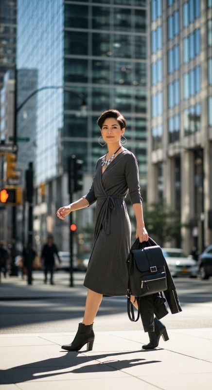 Navigate city streets with confidence in a charcoal grey wrap dress that balances professionalism with contemporary edge. The sophisticated neutral works for creative industry meetings, gallery openings, or urban exploration. Black ankle boots and a structured backpack blend style with practical city-living needs. Geometric silver jewelry and a sleek leather jacket add modern, architectural elements. This versatile piece transitions from daytime work to evening cultural events seamlessly. The dark grey color hides city dust while maintaining a polished, put-together appearance.