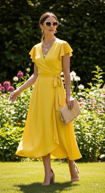 Embrace the vibrant energy of summer with a lemon-yellow wrap dress featuring delicate ruffle sleeves and a midi length that flows beautifully in the breeze. Pair this sunny number with nude block heels for comfortable all-day wear at outdoor celebrations. Add a woven straw clutch and oversized cat-eye sunglasses to complete this cheerful ensemble. Delicate gold layered necklaces will catch the sunlight perfectly against the bright fabric. This look is ideal for bridal showers, garden parties, or brunch with friends where you want to radiate warmth and joy. The adjustable wrap silhouette ensures a flattering fit for every body type while keeping you cool.