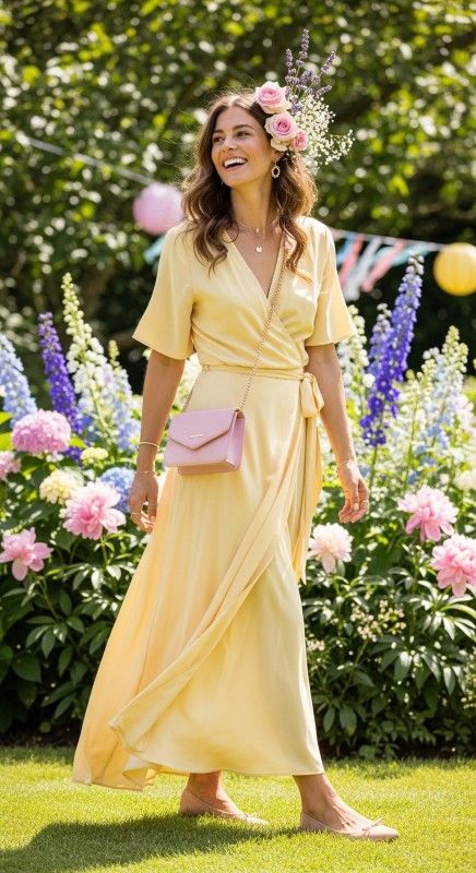Spread joy and warmth in a butter yellow wrap dress that radiates pure summer happiness and optimism. This cheerful hue is perfect for outdoor celebrations, baby showers, or brightening any summer gathering. Nude ballet flats and a pastel pink crossbody bag create a soft, feminine color combination. Delicate gold jewelry and fresh flowers in your hair enhance the sweet, romantic aesthetic. The sunny color instantly lifts moods and creates memorable photo opportunities. This dress embodies the carefree spirit and brightness of perfect summer days.