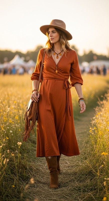 Bridge the seasons in a warm rust-colored wrap dress that hints at approaching autumn while remaining perfectly summer-appropriate. The earthy orange-brown tone works beautifully for late summer festivals, harvest celebrations, or transitional weather. Brown suede booties and a leather fringe bag add texture and bohemian flair. Amber stone jewelry and a felt wide-brim hat complete the earthy, natural aesthetic. This versatile color complements changing leaves and warm sunset skies beautifully. The wrap style keeps you comfortable as summer evenings begin to cool.