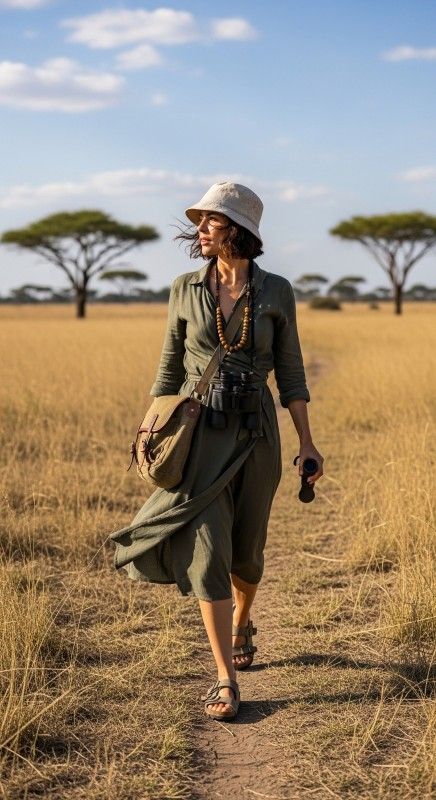 Embark on stylish adventures in an olive green wrap dress inspired by safari aesthetics and exploration. This versatile earth tone works for nature hikes, outdoor photography, or wildlife sanctuary visits. Khaki utility sandals and a canvas messenger bag provide practical functionality with fashion-forward appeal. Wooden bead necklaces and a linen bucket hat protect from sun while maintaining the adventurous theme. The military-inspired green connects you to nature while keeping you camera-ready. This outfit proves that practical outdoor wear can be undeniably stylish.