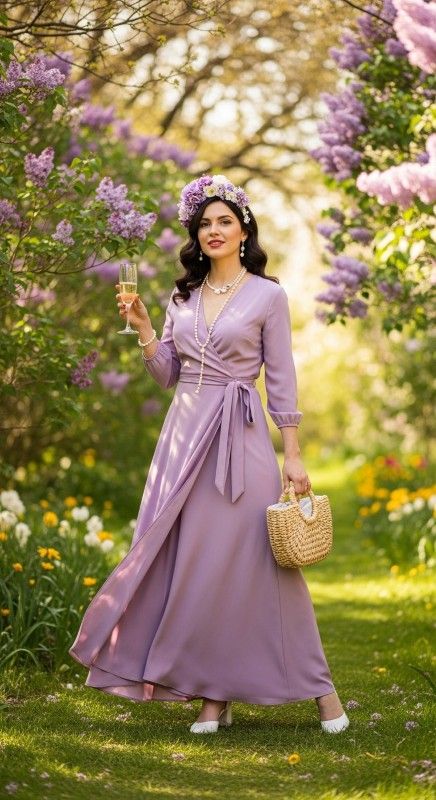 Celebrate the season’s transition in a soft lilac wrap dress that captures the last blooms of spring and summer’s arrival. This gentle purple hue is perfect for graduation parties, Mother’s Day brunch, or spring wedding guest attire. White block heels and a woven straw bag keep the look fresh and seasonally appropriate. Pearl accessories and a floral fascinator or headpiece add celebratory elegance. The delicate color photographs beautifully in natural spring light and blooming gardens. This dress marks special occasions with grace and timeless femininity.