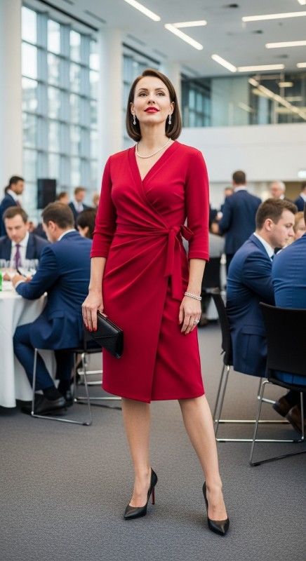 Own every room you enter in a bold crimson red wrap dress that commands attention and exudes self-assurance. This powerful color choice is ideal for important presentations, networking events, or when you need an extra confidence boost. Black stiletto pumps and a sleek black clutch create a classic, powerful combination. Statement red lipstick and diamond jewelry complete this unstoppable, boss-lady aesthetic. The vibrant red energizes both you and those around you, making you memorable. This is the dress you wear when you’re ready to conquer your goals.