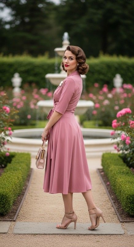 Step back in time with a dusty rose wrap dress that channels vintage glamour and timeless romance. This muted pink shade evokes 1950s elegance while remaining thoroughly modern and wearable. Nude T-strap heels and a vintage-inspired structured handbag enhance the retro aesthetic. Cameo jewelry and victory roll-inspired hair or soft curls complete the nostalgic look. Perfect for vintage car shows, retro-themed parties, or afternoon tea at historic hotels. The romantic color and classic silhouette create an effortlessly feminine, old-world charm.