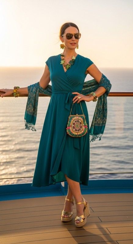 Set sail in style with a teal wrap dress that captures the vibrant spirit of Caribbean waters and tropical adventures. This cruise-perfect piece works for onboard dinners, port excursions, or beachside resort evenings. Gold wedge sandals and a beaded evening bag add vacation glamour to your evening wardrobe. Tropical-inspired jewelry and an elegant wrap or shawl provide versatility for air-conditioned venues. The rich blue-green color looks stunning in tropical sunset photography. This dress ensures you’re dressed perfectly for every cruise ship occasion.