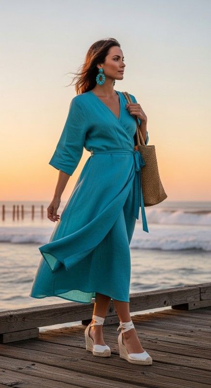 Channel seaside sophistication with an aqua blue wrap dress in lightweight linen blend that drapes effortlessly over your frame. The three-quarter sleeves provide sun protection while maintaining an airy feel perfect for coastal vacations or waterfront dining. Style with white espadrille wedges and a natural jute tote bag for that effortless beach-to-bar transition. Turquoise statement earrings will complement the dress color while adding a pop of personality. This versatile piece transitions seamlessly from daytime exploration to evening cocktails by the marina. The breathable fabric keeps you comfortable even in the warmest summer temperatures.
