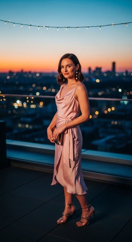 For those special summer evenings, a blush pink satin wrap dress offers luxurious comfort with its silky texture and flattering drape. The cowl neckline adds a touch of old Hollywood glamour while the tie waist creates a feminine silhouette. Pair with rose gold strappy sandals and a matching metallic clutch for a cohesive evening look. Delicate pearl drop earrings provide classic elegance without overwhelming the soft color palette. This dress is perfect for anniversary dinners, wedding receptions, or upscale rooftop gatherings. The satin fabric catches candlelight beautifully, making you shine throughout the night.
